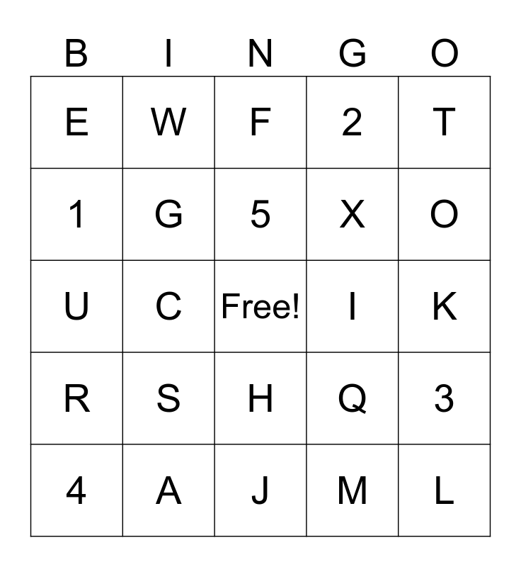 This bingo card has a free space and 30 words: A, B, C, D, E, F, G, H, I, J, K, L, M, N, O, P, Q, R, S, T, U, V, W, X, 1, 2, 3, 4, 5 and HOW DID YOU DO?.