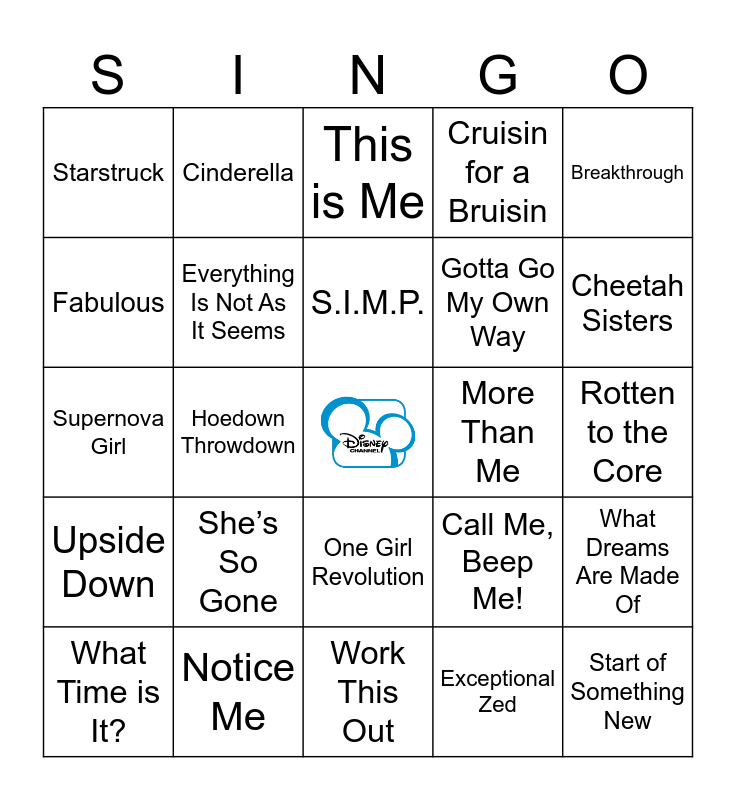 This bingo card has a free space and 43 words: Getcha Head in the Game, Start of Something New, All In This Together, What Time is It?, One Day, Exceptional Zed, This is Me, Can’t Back Down, Breakthrough, Notice Me, Cruisin for a Bruisin, More Than Me, One Girl Revolution, She’s So Gone, Wouldn’t Change a Thing, Work This Out, Push It to the Limit, Supernova Girl, Strut, Cheetah Sisters, Cinderella, One and the Same, Dance Me If You Can, Starstruck, Hero, Rotten to the Core, The Climb, The Best of Both Worlds, Call Me, Beep Me!, Upside Down, Evil Like Me, What Dreams Are Made Of, On My Own, Hoedown Throwdown, So Far So Great, Ordinary Girl, Jump to the Rhythm, S.I.M.P., Fabulous, Gotta Go My Own Way, Come On Out, Everything Is Not As It Seems and We Own the Night.