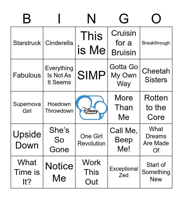 This bingo card has a free space and 43 words: Getcha Head In the Game, Start of Something New, All In This Together, What Time is It?, One Day, Exceptional Zed, This is Me, Can’t Back Down, Breakthrough, Notice Me, Cruisin for a Bruisin, More Than Me, One Girl Revolution, She’s So Gone, Wouldn’t Change a Thing, Work This Out, Push It to the Limit, Supernova Girl, Strut, Cheetah Sisters, Cinderella, One and the Same, Dance Me If You Can, Starstruck, Hero, Rotten to the Core, The Climb, The Best of Both Worlds, Call Me, Beep Me!, Upside Down, Evil Like Me, What Dreams Are Made Of, On My Own, Hoedown Throwdown, So Far So Great, Ordinary Girl, Jump to the Rhythm, SIMP, Fabulous, Gotta Go My Own Way, Come On Out, Everything Is Not As It Seems and We Own the Night.