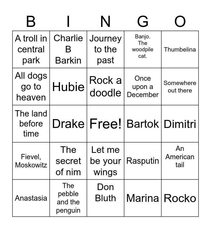 This bingo card has a free space and 24 words: The secret of nim, The pebble and the penguin, Rock a doodle, Anastasia, Thumbelina, A troll in central park, All dogs go to heaven, Charlie B Barkin, Bartok, Let me be your wings, Once upon a December, The land before time, Rasputin, An American tail, Hubie, Marina, Dimitri, Journey to the past, Somewhere out there, Drake, Rocko, Fievel, Moskowitz, Banjo. The woodpile cat. and Don Bluth.