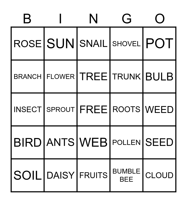 This bingo card has a free space and 32 words: BUMBLE BEE, WORM, SPROUT, WATER, BIRD, FLOWER, POT, SEED, SUN, GARDEN, TREE, SNAIL, SPIDER, LEAF, ROOTS, WATERING CAN, SOIL, INSECT, WEB, ANTS, POLLEN, ROCK, WEED, DAISY, CLOUD, SHOVEL, TRUNK, BRANCH, ROSE, FRUITS, VEGGIES and BULB.