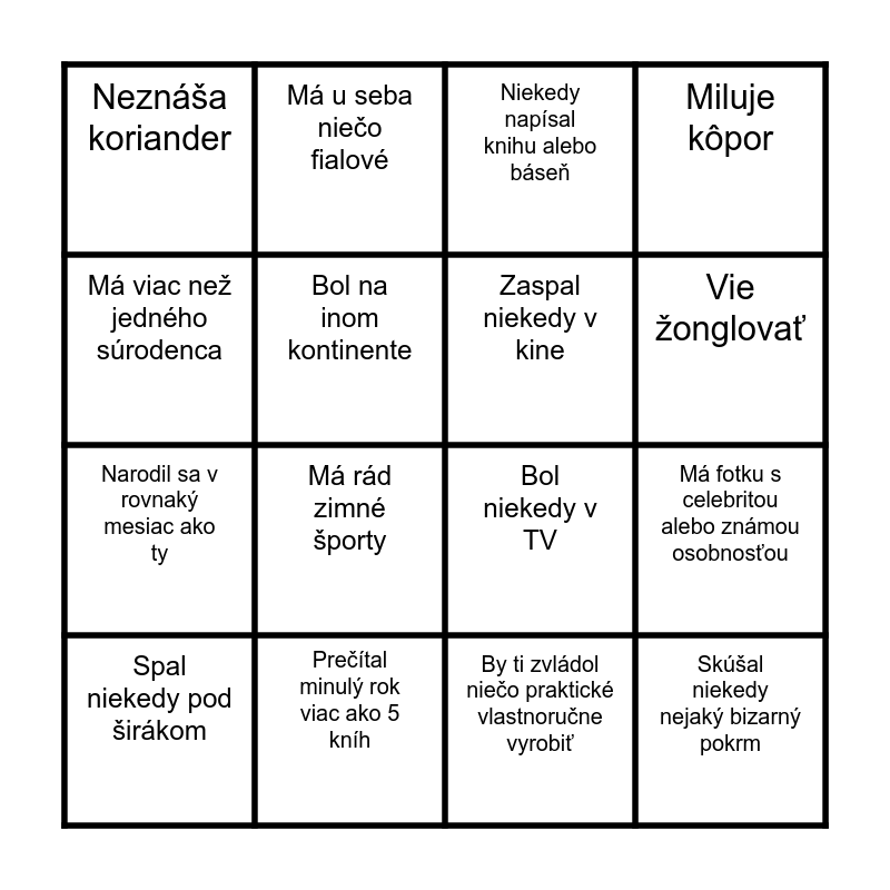 This bingo card has 16 words: Prečítal minulý rok viac ako 5 kníh, Má fotku s celebritou alebo známou osobnosťou, Niekedy napísal knihu alebo báseň, Neznáša koriander, Narodil sa v rovnaký mesiac ako ty, Má u seba niečo fialové, Bol niekedy v TV, By ti zvládol niečo praktické vlastnoručne vyrobiť, Má viac než jedného súrodenca, Bol na inom kontinente, Spal niekedy pod širákom, Miluje kôpor, Má rád zimné športy, Vie žonglovať, Zaspal niekedy v kine and Skúšal niekedy nejaký bizarný pokrm.