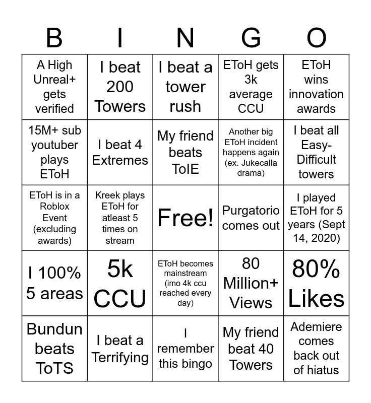 This bingo card has a free space and 24 words: 5k CCU, I beat a Terrifying, My friend beats ToIE, Bundun beats ToTS, EToH wins innovation awards, A High Unreal+ gets verified, 15M+ sub youtuber plays EToH, I beat 200 Towers, Purgatorio comes out, EToH becomes mainstream (imo 4k ccu reached every day), Another big EToH incident happens again (ex. Jukecalla drama), EToH is in a Roblox Event (excluding awards), 80 Million+ Views, 80% Likes, I beat 4 Extremes, My friend beat 40 Towers, I played EToH for 5 years (Sept 14, 2020), I beat a tower rush, I beat all Easy-Difficult towers, Kreek plays EToH for atleast 5 times on stream, Ademiere comes back out of hiatus, I 100% 5 areas, EToH gets 3k average CCU and I remember this bingo.