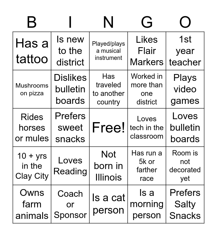 This bingo card has a free space and 34 words: Owns a Dog, Is a morning person, Is left handed, Clay City Alum, 10 + yrs in the Clay City, Dislikes bulletin boards, 1st year teacher, Owns farm animals, Is new to the district, Drives more than 30 minutes to work, Has traveled to another country, Played/plays a musical instrument, Drinks coffee, Has met a celebrity, Loves tech in the classroom, Plays video games, Coach or Sponsor, Rides horses or mules, Loves Reading, Has run a 5k or farther race, Not born in Illinois, Has a hidden talent, Has a tattoo, Loves bulletin boards, Is a cat person, Prefers Salty Snacks, Likes Flair Markers, Is the youngest sibling, Worked in more than one district, Mushrooms on pizza, Prefer paper planners, Prefers sweet snacks, Room is not decorated yet and Listens to podcasts.