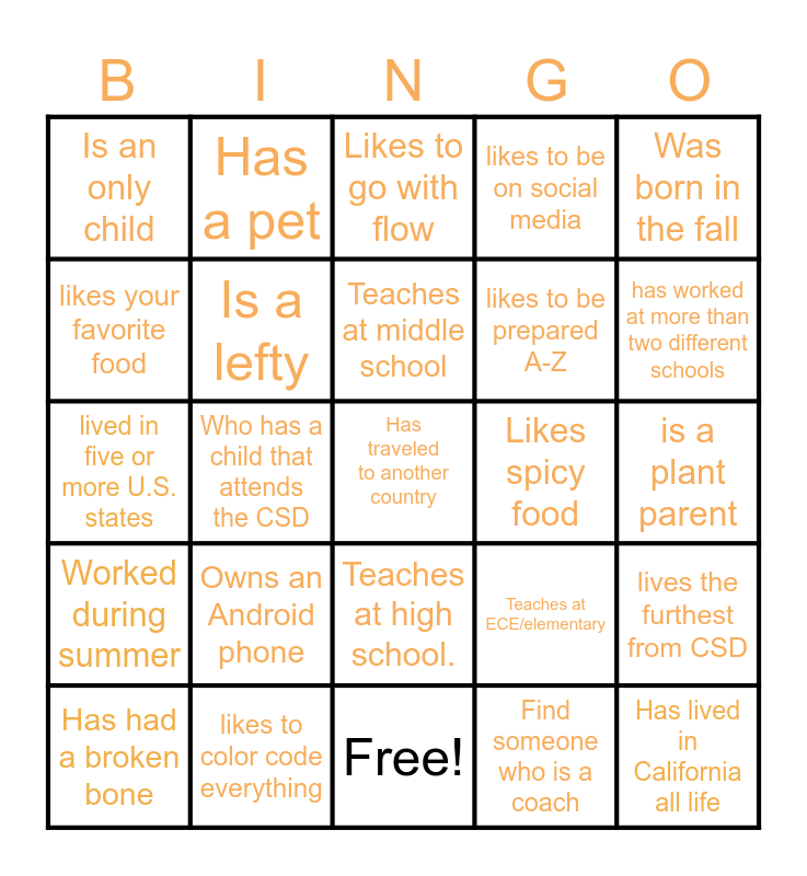 This bingo card has 25 words: Worked during summer, likes to color code everything, Has traveled to another country, Find someone who is a coach, Was born in the fall, Is an only child, Has a pet, Likes to go with flow, Likes spicy food, lives the furthest from CSD, likes your favorite food, Is a lefty, Free!, Teaches at ECE/elementary, has worked at more than two different schools, Has had a broken bone, Who has a child that attends the CSD, Teaches at middle school, likes to be prepared A-Z, is a plant parent, lived in five or more U.S. states, Owns an Android phone, Teaches at high school., likes to be on social media and Has lived in California all life.