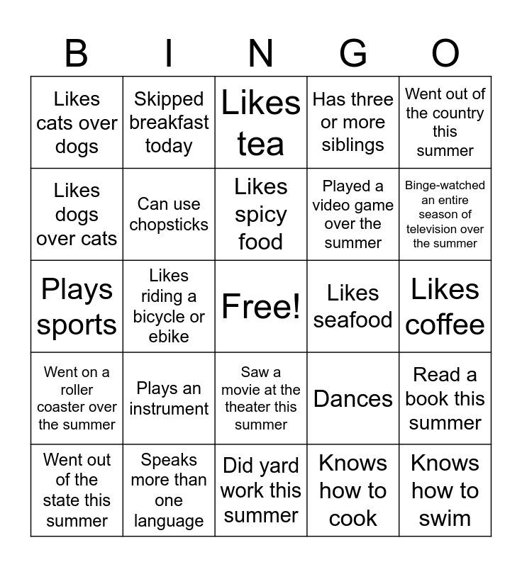 This bingo card has a free space and 24 words: Plays an instrument, Speaks more than one language, Likes spicy food, Went out of the state this summer, Went out of the country this summer, Likes cats over dogs, Likes dogs over cats, Skipped breakfast today, Likes seafood, Saw a movie at the theater this summer, Played a video game over the summer, Plays sports, Dances, Read a book this summer, Can use chopsticks, Knows how to cook, Likes coffee, Likes tea, Binge-watched an entire season of television over the summer, Likes riding a bicycle or ebike, Knows how to swim, Went on a roller coaster over the summer, Has three or more siblings and Did yard work this summer.