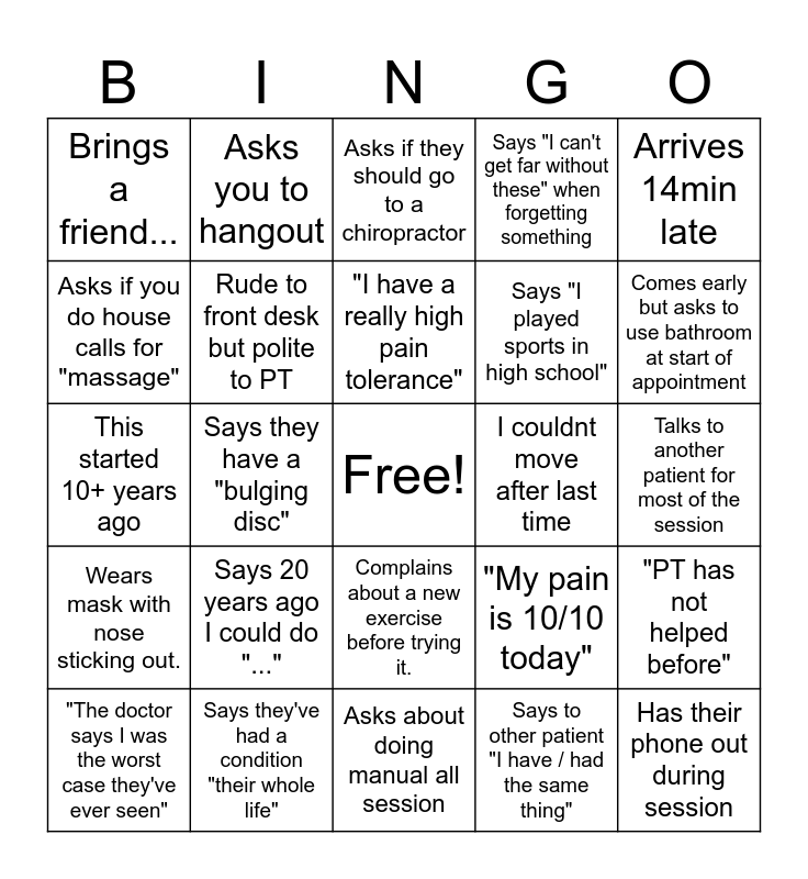 This bingo card has a free space and 24 words: Says 20 years ago I could do "...", Says they've had a condition "their whole life", "I have a really high pain tolerance", "The doctor says I was the worst case they've ever seen", Arrives 14min late, Brings a friend..., Asks if you do house calls for "massage", Asks you to hangout, I couldnt move after last time, Complains about a new exercise before trying it., Says "I played sports in high school", This started 10+ years ago, "My pain is 10/10 today", "PT has not helped before", Rude to front desk but polite to PT, Says to other patient "I have / had the same thing", Talks to another patient for most of the session, Asks if they should go to a chiropractor, Comes early but asks to use bathroom at start of appointment, Says they have a "bulging disc", Has their phone out during session, Wears mask with nose sticking out., Says "I can't get far without these" when forgetting something and Asks about doing manual all session.