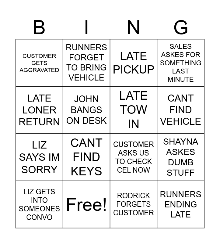 This bingo card has 16 words: Free!, SHAYNA ASKES DUMB STUFF, LATE PICKUP, CUSTOMER GETS AGGRAVATED, LIZ SAYS IM SORRY, RUNNERS FORGET TO BRING VEHICLE, CUSTOMER ASKS US TO CHECK CEL NOW, RODRICK FORGETS CUSTOMER, LATE LONER RETURN, JOHN BANGS ON DESK, LIZ GETS INTO SOMEONES CONVO, SALES ASKES FOR SOMETHING LAST MINUTE, CANT FIND KEYS, CANT FIND VEHICLE, LATE TOW IN and RUNNERS ENDING LATE.