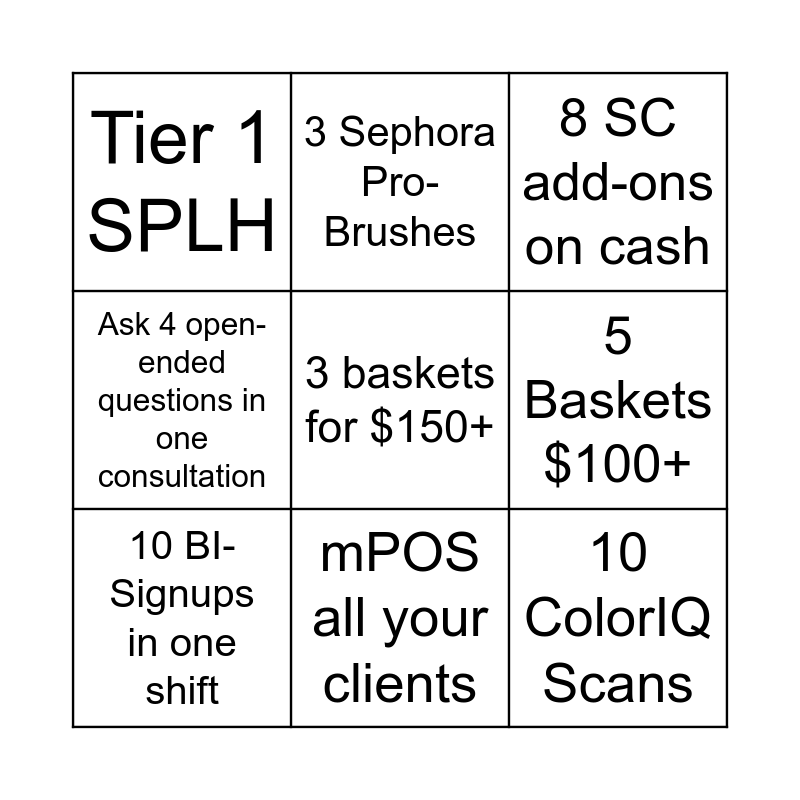 This bingo card has a free space and 8 words: 5 Baskets $100+, 8 SC add-ons on cash, 3 Sephora Pro-Brushes, 10 BI-Signups in one shift, Tier 1 SPLH, 10 ColorIQ Scans, Ask 4 open-ended questions in one consultation and mPOS all your clients.