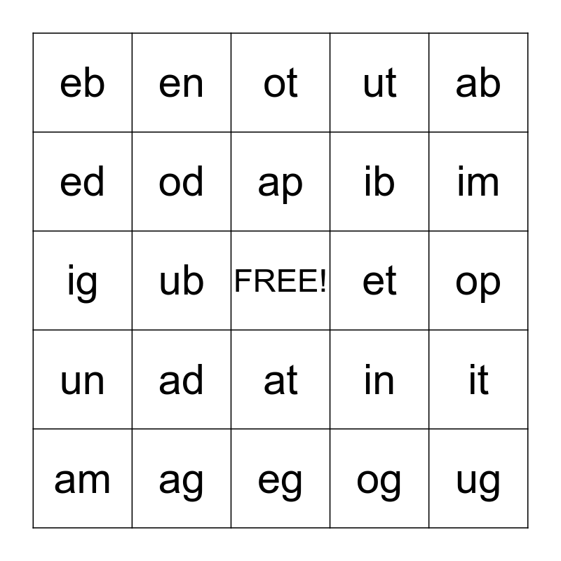This bingo card has a free space and 24 words: ad, ag, ap, am, ab, eb, ed, en, et, at, ib, ig, in, it, od, og, op, ot, im, ub, ug, un, ut and eg.