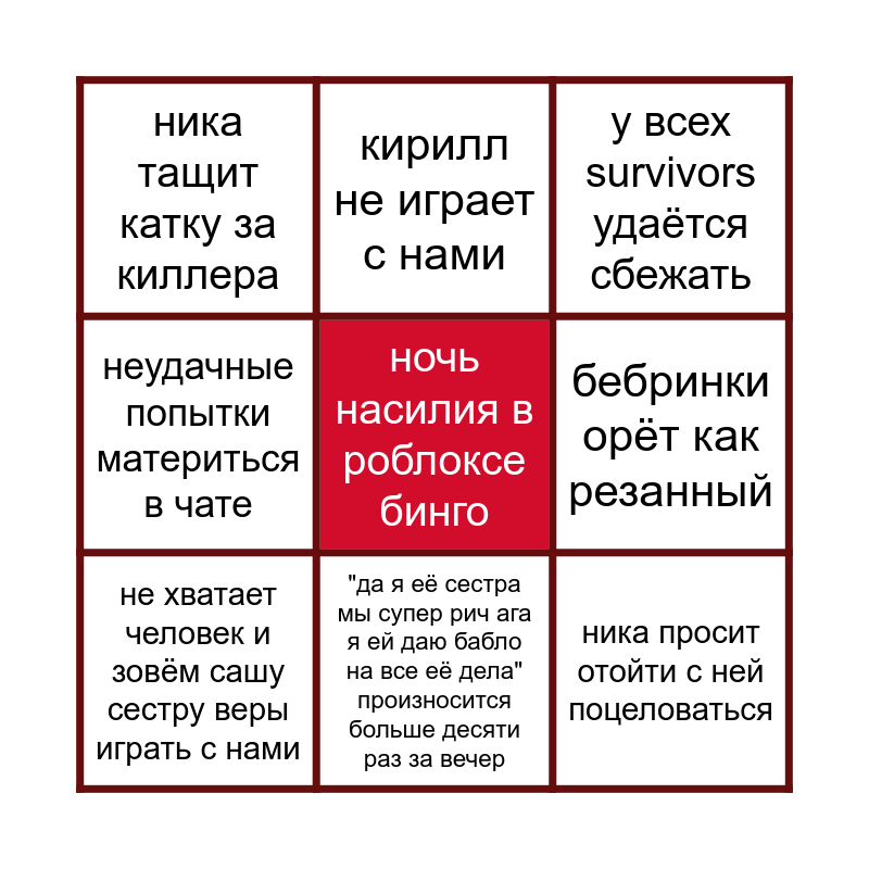 This bingo card has a free space and 8 words: бебринки орёт как резанный, у всех survivors удаётся сбежать, кирилл не играет с нами, не хватает человек и зовём сашу сестру веры играть с нами, ника тащит катку за киллера, ника просит отойти с ней поцеловаться, неудачные попытки материться в чате and "да я её сестра мы супер рич ага я ей даю бабло на все её дела" произносится больше десяти раз за вечер.