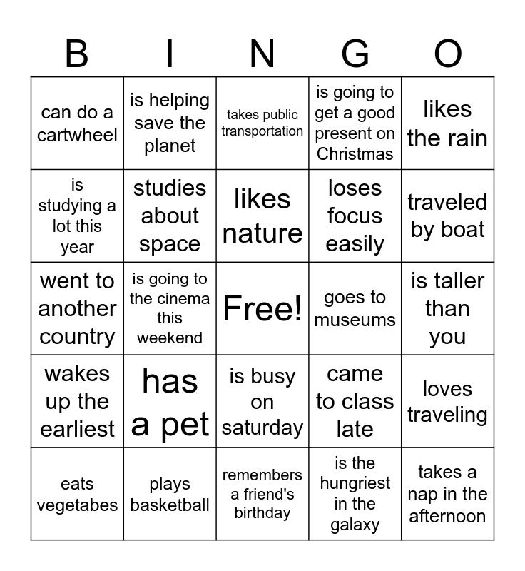 This bingo card has a free space and 24 words: has a pet, plays basketball, likes nature, eats vegetabes, likes the rain, can do a cartwheel, is studying a lot this year, is helping save the planet, goes to museums, is busy on saturday, loses focus easily, went to another country, came to class late, loves traveling, studies about space, is the hungriest in the galaxy, is taller than you, takes public transportation, traveled by boat, is going to the cinema this weekend, takes a nap in the afternoon, wakes up the earliest, is going to get a good present on Christmas and remembers a friend's birthday.