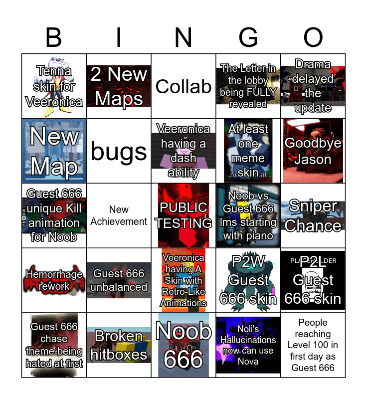 This bingo card has 20 images, a free space and 24 words: Guest 666 unbalanced, Broken hitboxes, Veeronica having a dash ability, Guest 666 chase theme being hated at first, Drama delayed the update, Tenna skin for Veeronica, New Map, 2 New Maps, Noob vs Guest 666 lms starting with piano, Veeronica having A Skin with Retro-Like Animations, At least one meme skin, Guest 666 unique Kill animation for Noob, P2W Guest 666 skin, P2L Guest 666 skin, bugs, Noli's Hallucinations now can use Nova, Sniper Chance, Collab, Goodbye Jason, New Achievement, People reaching Level 100 in first day as Guest 666, Hemorrhage rework, The Letter in the lobby being FULLY revealed and Noob 666.