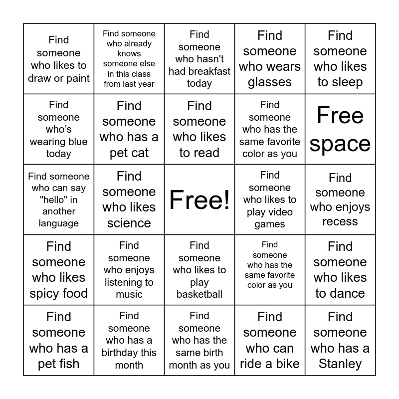 This bingo card has a free space and 27 words: Find someone who has the same favorite color as you, Find someone who has the same birth month as you, Find someone who has the same favorite color as you, Find someone who has the same birth month as you, Find someone who’s wearing blue today, Find someone who hasn't had breakfast today, Find someone who already knows someone else in this class from last year, Find someone who likes spicy food, Find someone who likes to play video games, Find someone who likes to dance, Find someone who can say "hello" in another language, Find someone who wears glasses, Find someone who has a pet fish, Find someone who has a birthday this month, Free space, Find someone who likes ice cream, Find someone who has a pet cat, Find someone who likes to read, Find someone who enjoys listening to music, Find someone who likes to draw or paint, Find someone who enjoys recess, Find someone who can ride a bike, Find someone who likes science, Find someone who has a Stanley, Find someone who likes to play basketball, Find someone who likes to sleep and Find someone who can whistle.
