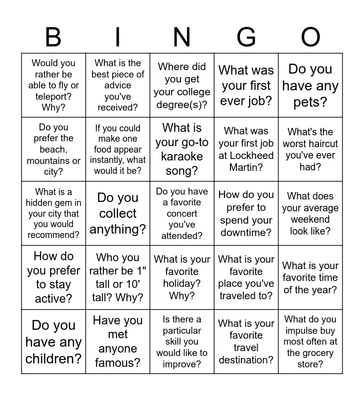 This bingo card has 28 words: What is your favorite time of the year?, What is your favorite sports team?, What was your first job at Lockheed Martin?, What is your favorite travel destination?, Do you prefer the beach, mountains or city?, Where did you get your college degree(s)?, What is the best piece of advice you've received?, How do you prefer to stay active?, How do you prefer to spend your downtime?, Do you have any children?, What is a hidden gem in your city that you would recommend?, What was your first ever job?, Have you met anyone famous?, Is there a particular skill you would like to improve?, What's the worst haircut you've ever had?, What is the last book you read?, Who you rather be 1" tall or 10' tall? Why?, If you could make one food appear instantly, what would it be?, What is your go-to karaoke song?, What is your favorite holiday? Why?, Would you rather be able to fly or teleport? Why?, What do you impulse buy most often at the grocery store?, Do you have a favorite concert you've attended?, Do you collect anything?, What does your average weekend look like?, What is your favorite place you've traveled to?, Do you have any pets? and You suddenly have a plane ticket to go anywhere - where are you going?.