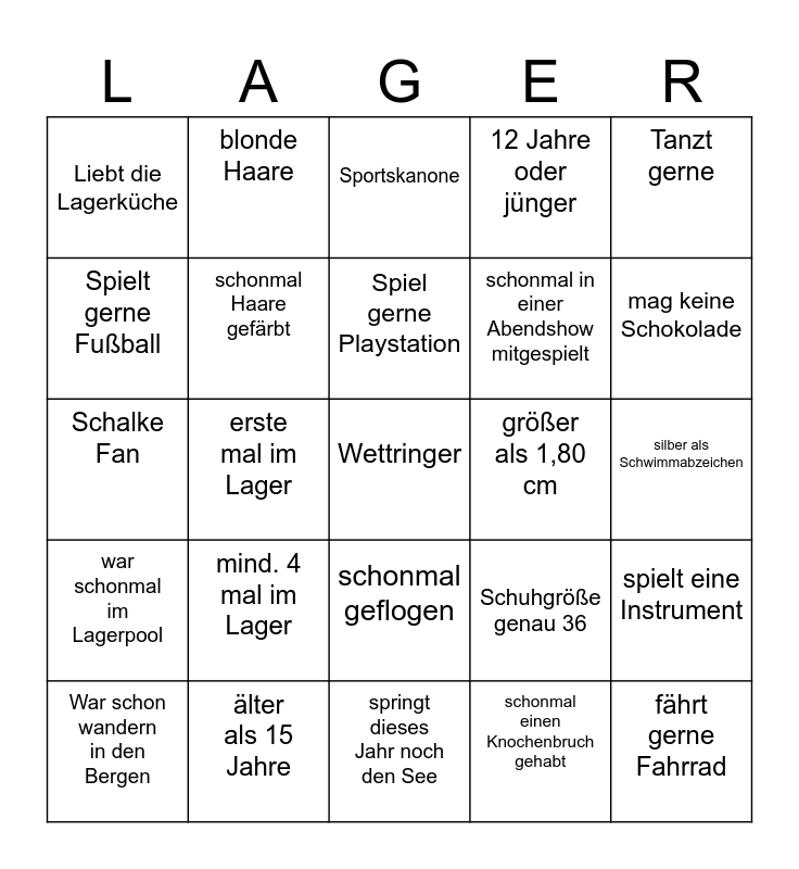 This bingo card has a free space and 24 words: mind. 4 mal im Lager, älter als 15 Jahre, Spiel gerne Playstation, War schon wandern in den Bergen, Tanzt gerne, Liebt die Lagerküche, Spielt gerne Fußball, blonde Haare, größer als 1,80 cm, schonmal geflogen, schonmal in einer Abendshow mitgespielt, Schalke Fan, Schuhgröße genau 36, spielt eine Instrument, schonmal Haare gefärbt, schonmal einen Knochenbruch gehabt, silber als Schwimmabzeichen, Sportskanone, mag keine Schokolade, erste mal im Lager, fährt gerne Fahrrad, war schonmal im Lagerpool, 12 Jahre oder jünger and springt dieses Jahr noch den See.
