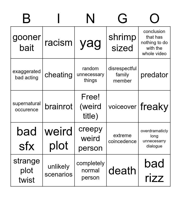 This bingo card has a free space and 24 words: weird plot, unlikely scenarios, random unnecessary things, strange plot twist, conclusion that has nothing to do with the whole video, gooner bait, exaggerated bad acting, racism, voiceover, creepy weird person, disrespectful family member, supernatural occurence, extreme coincedence, overdramaticly long unnecesarry dialogue, cheating, death, freaky, yag, predator, brainrot, bad rizz, bad sfx, shrimp sized and completely normal person.