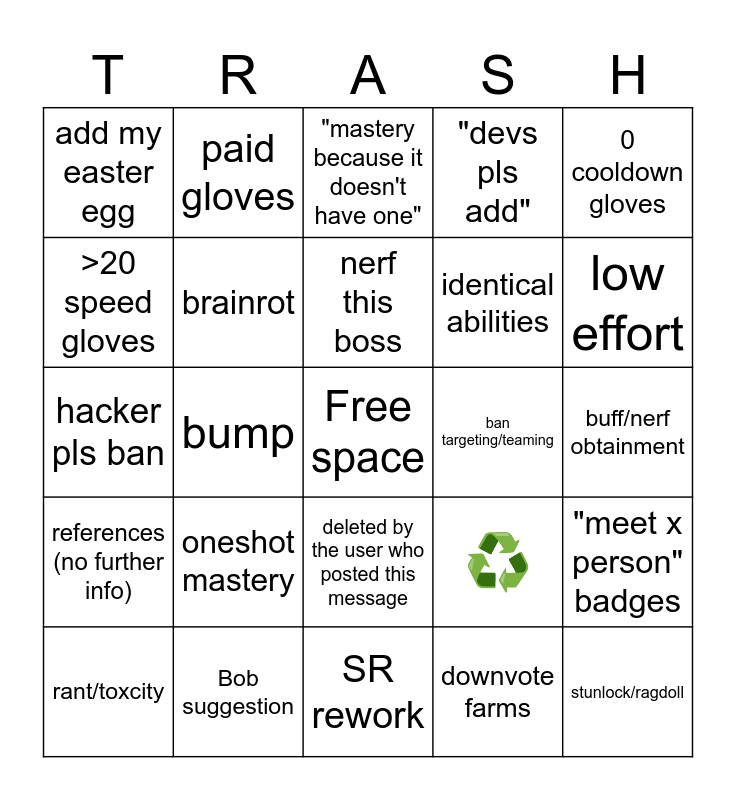 This bingo card has a free space and 24 words: oneshot mastery, Bob suggestion, nerf this boss, rant/toxcity, 0 cooldown gloves, add my easter egg, >20 speed gloves, paid gloves, ban targeting/teaming, deleted by the user who posted this message, identical abilities, hacker pls ban, ♻️, "meet x person" badges, brainrot, downvote farms, buff/nerf obtainment, "mastery because it doesn't have one", low effort, bump, stunlock/ragdoll, references (no further info), "devs pls add" and SR rework.