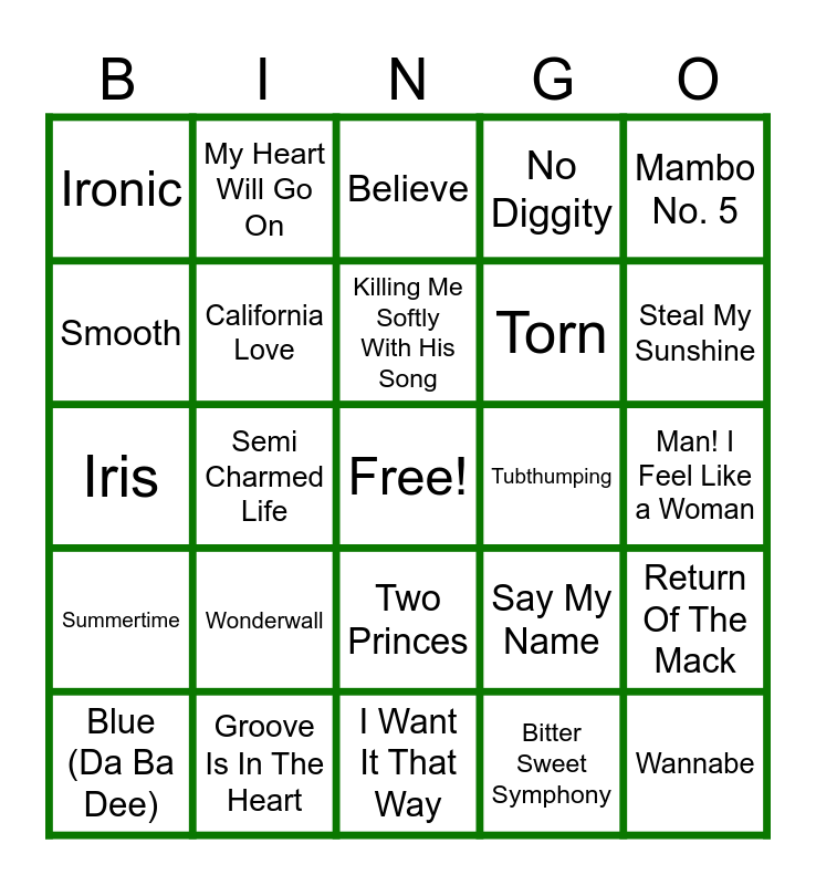 This bingo card has a free space and 48 words: ...Baby One More Time, Wannabe, No Scrubs, I Want It That Way, Wonderwall, I Will Always Love You, My Heart Will Go On, Livin’ La Vida Loca, Smooth, Gangsta’s Paradise, California Love, No Diggity, Return Of The Mack, Say My Name, Genie In A Bottle, Hypnotize, Killing Me Softly With His Song, Tubthumping, All Star, Mambo No. 5, Semi Charmed Life, Bitter Sweet Symphony, Ironic, Torn, Kiss Me, Steal My Sunshine, Blue (Da Ba Dee), Fly, Two Princes, Summertime, Ice Ice Baby, U Can’t Touch This, Jump Around, MMM Bop, Groove Is In The Heart, You Get What You Give, What’s My Age Again, Man! I Feel Like a Woman, Enter Sandman, Californication, Under the Bridge, Don’t Speak, Believe, Basket Case, Iris, Life Is A Highway, Black Or White and Creep.