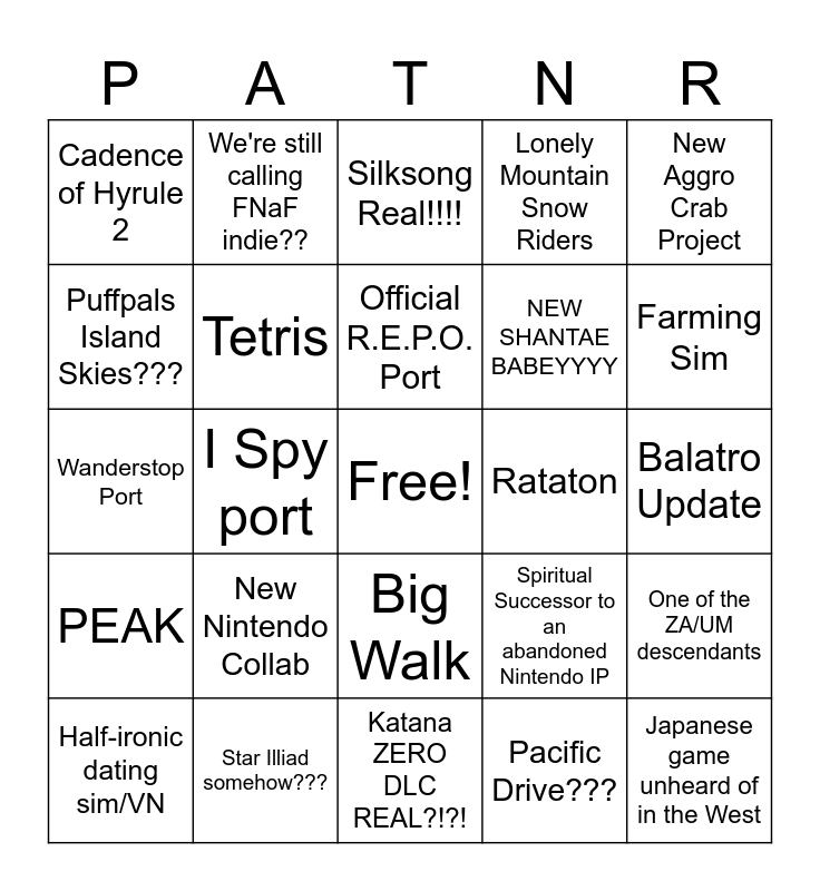 This bingo card has a free space and 31 words: Katana ZERO DLC REAL?!?!, Devolver Digital Game, I Spy port, Available Now, Cadence of Hyrule 2, Silksong Real!!!!, Tetris, Spiritual Successor to an abandoned Nintendo IP, Rataton, Pacific Drive???, Balatro Update, Japanese game unheard of in the West, Fairune Fragment Isle, Lil Gator Game DLC, Farming Sim, Haunted Choclatier, One of the ZA/UM descendants, New Nintendo Collab, PEAK, Big Walk, New Aggro Crab Project, Despite the Palworld Lawsuit, monster catcher, Half-ironic dating sim/VN, We're still calling FNaF indie??, NEW SHANTAE BABEYYYY, Puffpals Island Skies???, Lonely Mountain Snow Riders, Wanderstop Port, Star Illiad somehow???, Official R.E.P.O. Port and RUSTBOUND somehow already back on their feet and in a direct.