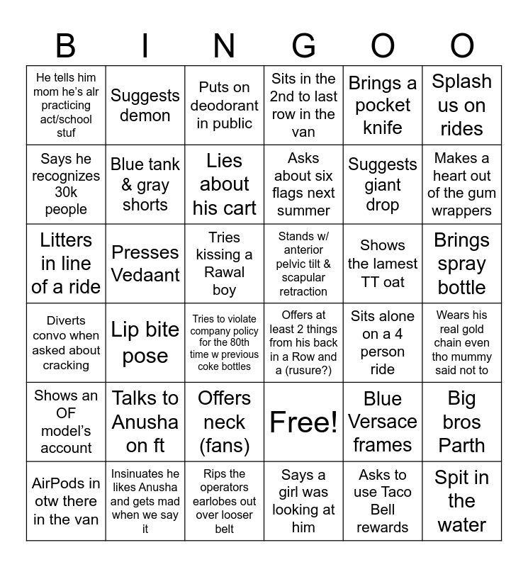 This bingo card has 36 words: Free!, Offers neck (fans), Says a girl was looking at him, Says he recognizes 30k people, Diverts convo when asked about cracking, Stands w/ anterior pelvic tilt & scapular retraction, Blue tank & gray shorts, Rips the operators earlobes out over looser belt, Brings a pocket knife, Blue Versace frames, Makes a heart out of the gum wrappers, Sits in the 2nd to last row in the van, Big bros Parth, Presses Vedaant, Asks about six flags next summer, He tells him mom he’s alr practicing act/school stuf, Shows an OF model’s account, Shows the lamest TT oat, Litters in line of a ride, Puts on deodorant in public, Tries kissing a Rawal boy, Lip bite pose, Offers at least 2 things from his back in a Row and a (rusure?), Tries to violate company policy for the 80th time w previous coke bottles, Sits alone on a 4 person ride, Suggests demon, Suggests giant drop, Insinuates he likes Anusha and gets mad when we say it, Lies about his cart, Splash us on rides, Spit in the water, AirPods in otw there in the van, Wears his real gold chain even tho mummy said not to, Brings spray bottle, Talks to Anusha on ft and Asks to use Taco Bell rewards.