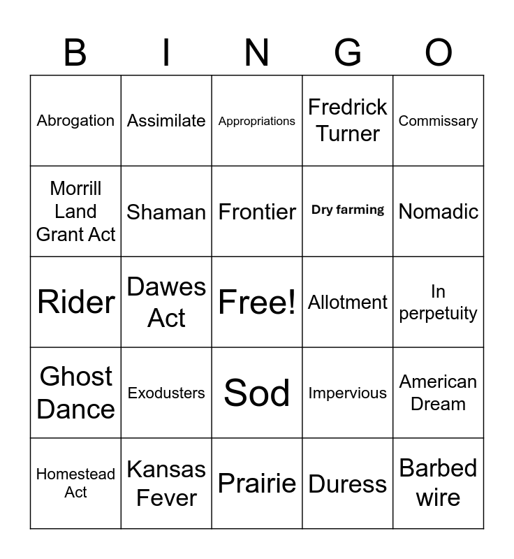 This bingo card has 1 images, a free space and 23 words: Homestead Act, Exodusters, Frontier, Duress, Commissary, Abrogation, Assimilate, Appropriations, Allotment, In perpetuity, Rider, Shaman, Impervious, American Dream, Morrill Land Grant Act, Kansas Fever, Prairie, Fredrick Turner, Nomadic, Ghost Dance, Dawes Act, Sod and Barbed wire.
