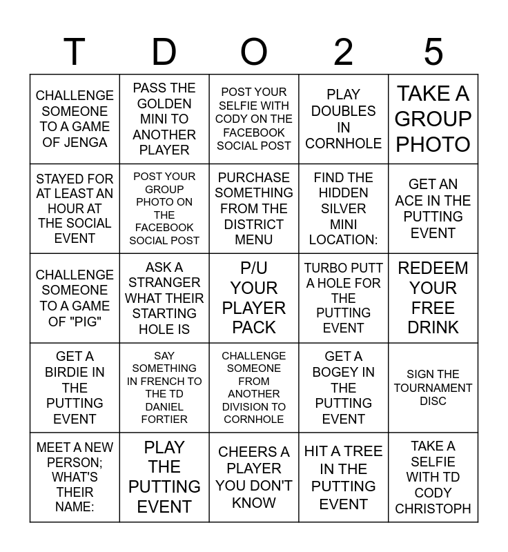 This bingo card has a free space and 24 words: SAY SOMETHING IN FRENCH TO THE TD DANIEL FORTIER, PLAY THE PUTTING EVENT, PURCHASE SOMETHING FROM THE DISTRICT MENU, MEET A NEW PERSON; WHAT'S THEIR NAME:, TAKE A GROUP PHOTO, CHALLENGE SOMEONE TO A GAME OF JENGA, STAYED FOR AT LEAST AN HOUR AT THE SOCIAL EVENT, PASS THE GOLDEN MINI TO ANOTHER PLAYER, TURBO PUTT A HOLE FOR THE PUTTING EVENT, CHALLENGE SOMEONE FROM ANOTHER DIVISION TO CORNHOLE, FIND THE HIDDEN SILVER MINI LOCATION:, CHALLENGE SOMEONE TO A GAME OF "PIG", GET A BOGEY IN THE PUTTING EVENT, SIGN THE TOURNAMENT DISC, POST YOUR GROUP PHOTO ON THE FACEBOOK SOCIAL POST, HIT A TREE IN THE PUTTING EVENT, REDEEM YOUR FREE DRINK, POST YOUR SELFIE WITH CODY ON THE FACEBOOK SOCIAL POST, GET AN ACE IN THE PUTTING EVENT, ASK A STRANGER WHAT THEIR STARTING HOLE IS, TAKE A SELFIE WITH TD CODY CHRISTOPH, GET A BIRDIE IN THE PUTTING EVENT, PLAY DOUBLES IN CORNHOLE and CHEERS A PLAYER YOU DON'T KNOW.