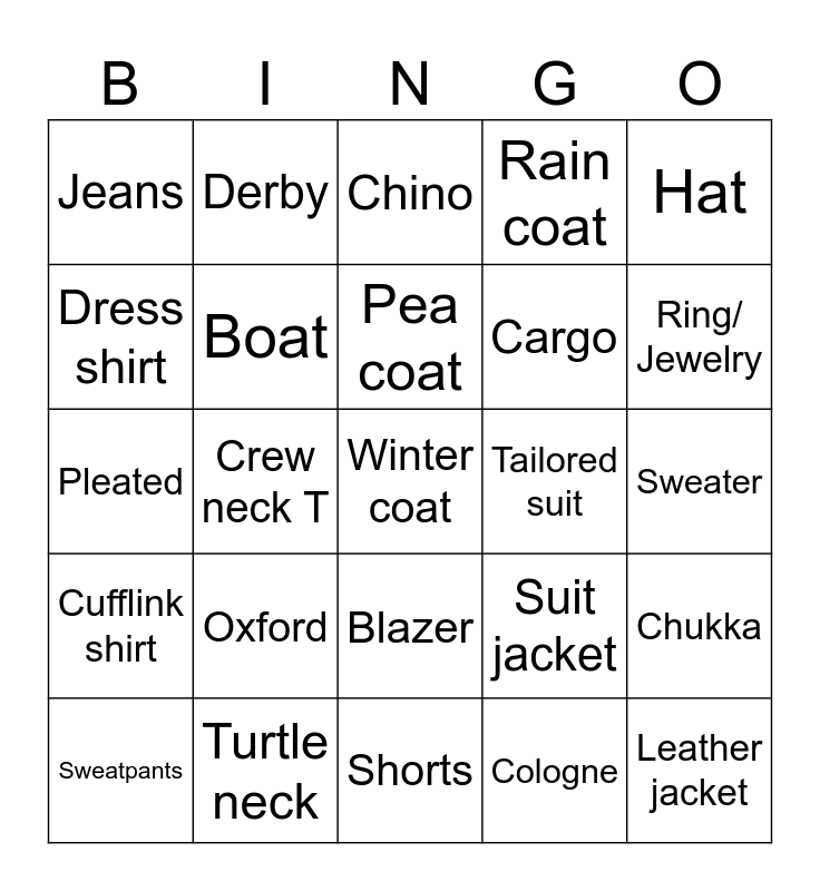 This bingo card has 37 words: Captoe, Belt, Brogue, Boat, Chukka, Oxford, Pea coat, Driving, Hat, V neck T, Crew neck T, Rain coat, Winter coat, Sweater, Dress shirt, Cufflink shirt, Sunglasses, Chino, Blazer, Tailored suit, Jeans, Ring/ Jewelry, Sweatpants, Shorts, Watch, Cologne, Derby, Sneakers, Loafers, Pomade/ Hair products, Polo, Turtle neck, Pleated, Leather jacket, Suit jacket, Cargo and Jean jacket.