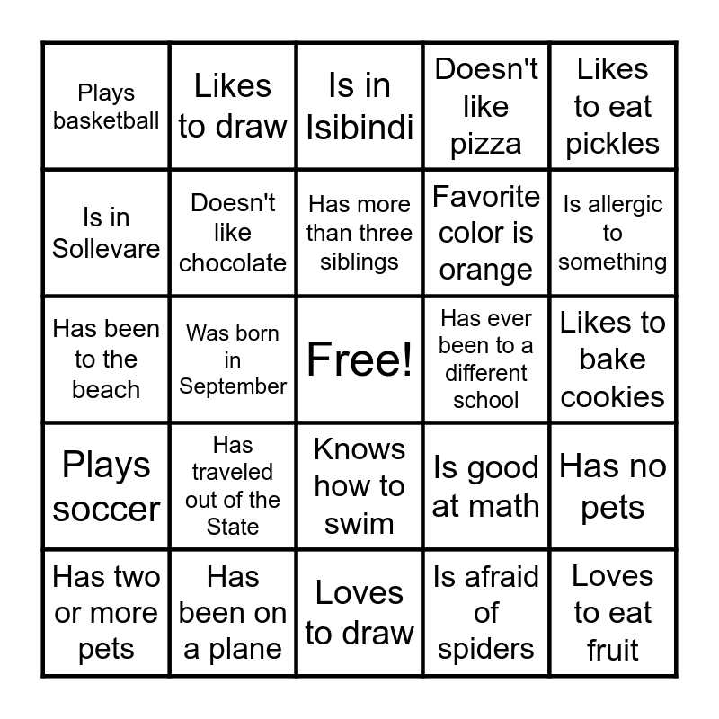 This bingo card has a free space and 24 words: Has traveled out of the State, Has been on a plane, Has more than three siblings, Has two or more pets, Likes to eat pickles, Plays basketball, Is in Sollevare, Likes to draw, Has ever been to a different school, Knows how to swim, Favorite color is orange, Has been to the beach, Is good at math, Has no pets, Doesn't like chocolate, Is afraid of spiders, Likes to bake cookies, Is in Isibindi, Is allergic to something, Was born in September, Loves to eat fruit, Plays soccer, Doesn't like pizza and Loves to draw.