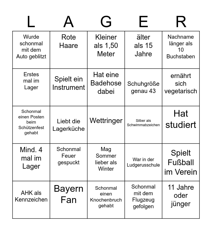 This bingo card has a free space and 24 words: Schonmal Feuer gespuckt, Bayern Fan, Hat eine Badehose dabei, AHK als Kennzeichen, Nachname länger als 10 Buchstaben, Wurde schonmal mit dem Auto geblitzt, Erstes mal im Lager, Rote Haare, Silber als Schwimmabzeichen, Mag Sommer lieber als Winter, Schuhgröße genau 43, Schonmal einen Posten beim Schützenfest gehabt, War in der Ludgerusschule, Spielt Fußball im Verein, Spielt ein Instrument, Schonmal mit dem Flugzeug gefolgen, Hat studiert, Kleiner als 1,50 Meter, ernährt sich vegetarisch, Liebt die Lagerküche, 11 Jahre oder jünger, Mind. 4 mal im Lager, älter als 15 Jahre and Schonmal einen Knochenbruch gehabt.