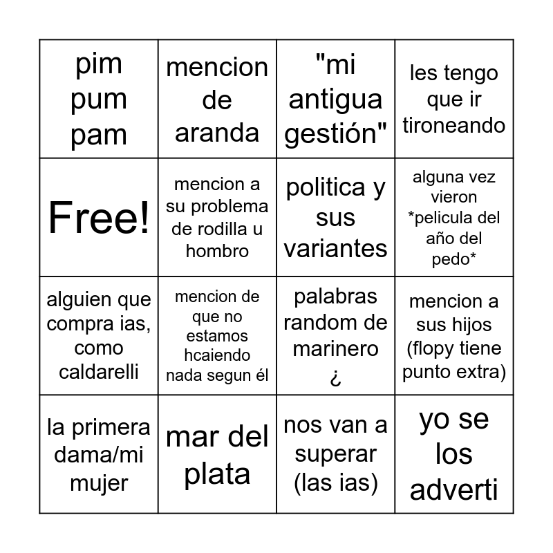 This bingo card has 16 words: mar del plata, mencion a sus hijos (flopy tiene punto extra), "mi antigua gestión", pim pum pam, alguien que compra ias, como caldarelli, mencion de aranda, palabras random de marinero ¿, nos van a superar (las ias), Free!, mencion a su problema de rodilla u hombro, la primera dama/mi mujer, les tengo que ir tironeando, mencion de que no estamos hcaiendo nada segun él, alguna vez vieron *pelicula del año del pedo*, politica y sus variantes and yo se los adverti.