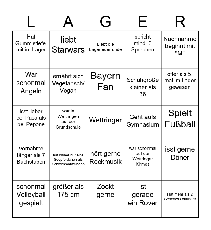 This bingo card has a free space and 24 words: hat bisher nur eine Seepferdchen als Schwimmabzeichen, größer als 175 cm, Bayern Fan, schonmal Volleyball gespielt, Nachnahme beginnt mit "M", Hat Gummistiefel mit im Lager, War schonmal Angeln, liebt Starwars, Geht aufs Gymnasium, hört gerne Rockmusik, Schuhgröße kleiner als 36, isst lieber bei Pasa als bei Pepone, war schonmal auf der Wettringer Kirmes, isst gerne Döner, ernährt sich Vegetarisch/ Vegan, ist gerade ein Rover, Spielt Fußball, Liebt die Lagerfeuerrunde, öfter als 5. mal im Lager gewesen, war in Wettringen auf der Grundschule, Hat mehr als 2 Geschwisterkinder, Vornahme länger als 7 Buchstaben, spricht mind. 3 Sprachen and Zockt gerne.