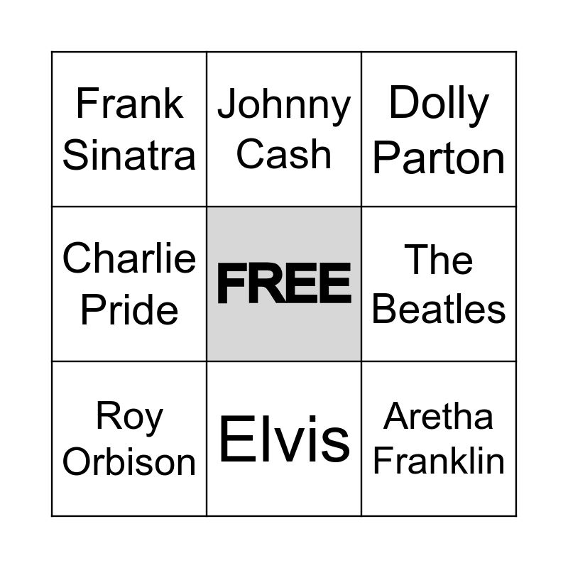 This bingo card has a free space and 8 words: The Beatles, Dolly Parton, Johnny Cash, Roy Orbison, Frank Sinatra, Aretha Franklin, Charlie Pride and Elvis.