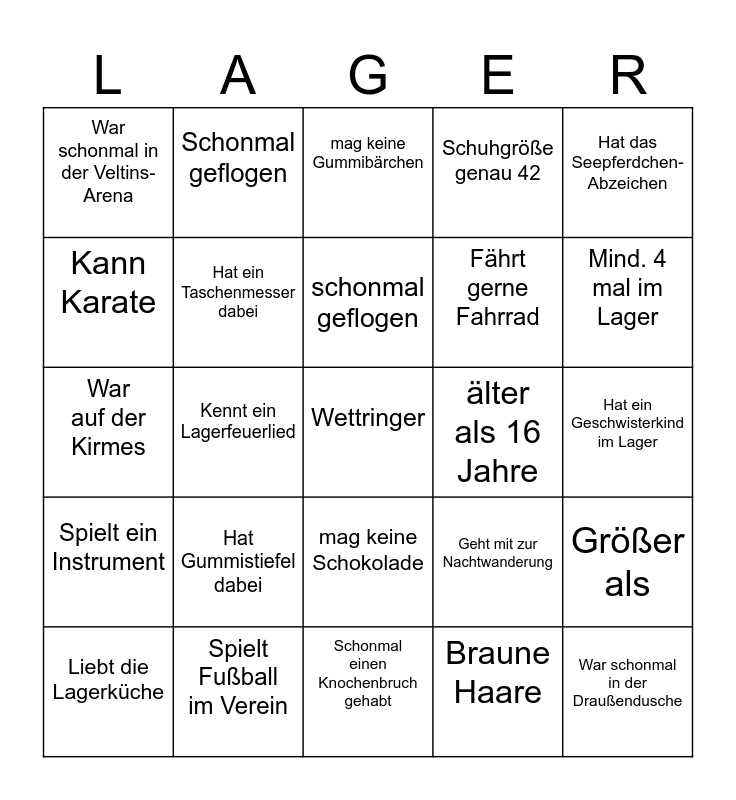 This bingo card has a free space and 24 words: Hat Gummistiefel dabei, Spielt Fußball im Verein, schonmal geflogen, Liebt die Lagerküche, Hat das Seepferdchen- Abzeichen, War schonmal in der Veltins- Arena, Kann Karate, Schonmal geflogen, älter als 16 Jahre, mag keine Schokolade, Fährt gerne Fahrrad, War auf der Kirmes, Geht mit zur Nachtwanderung, Größer als, Hat ein Taschenmesser dabei, Braune Haare, Hat ein Geschwisterkind im Lager, mag keine Gummibärchen, Mind. 4 mal im Lager, Kennt ein Lagerfeuerlied, War schonmal in der Draußendusche, Spielt ein Instrument, Schuhgröße genau 42 and Schonmal einen Knochenbruch gehabt.