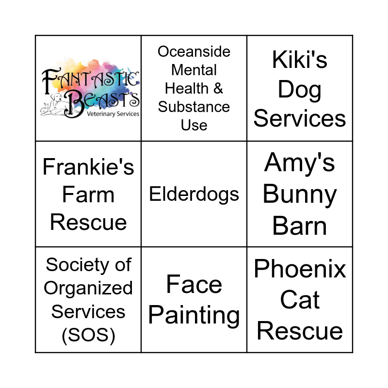 This bingo card has 1 images and 8 words: Society of Organized Services (SOS), Kiki's Dog Services, Oceanside Mental Health & Substance Use, Frankie's Farm Rescue, Amy's Bunny Barn, Elderdogs, Phoenix Cat Rescue and Face Painting.