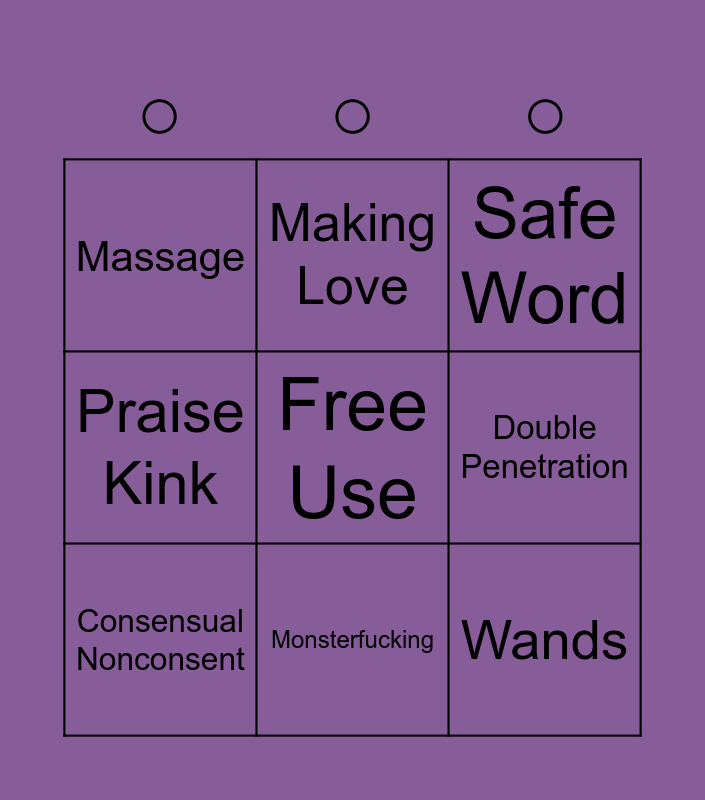 This bingo card has a free space and 8 words: Double Penetration, Safe Word, Making Love, Consensual Nonconsent, Massage, Wands, Praise Kink and Monsterfucking.