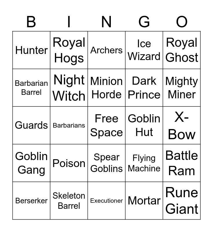 This bingo card has a free space and 120 words: Tesla, Skeletons, Knight, Zap, Fireball, Bowler, Ice Wizard, Graveyard, Battle Ram, Furnace, Pekka, Mega Knight, Fire Spirit, Electro Spirit, Ice Spirit, Goblins, Spear Goblins, Bomber, Bats, Giant Snowball, Berserker, Archers, Minions, Arrows, Cannon, Goblin Gang, Skeleton Barrel, Firecracker, Royal Delivery, Skeleton Dragons, Mortar, Barbarians, Minion Horde, Rascals, Royal Giant, Elite Barbarians, Royal Recruits, Heal Spirit, Ice Golem, Suspicious Bush, Tombstone, Mega Minion, Dart Goblin, Earthquake, Elixir Golem, Musketeer, Mini Pekka, Goblin Hut, Goblin Cage, Valkyrie, Bomb Tower, Hog Rider, Flying Machine, Battle Healer, Zappies, Goblin Demolisher, Giant, Wizard, Inferno Tower, Royal Hogs, Rocket, Barbarian Hut, Elixir Pump, Three Musketeers, Mirror, Barbarian Barrel, Wall Breakers, Rage, Goblin Curse, Skeleton Army, Guards, Goblin Barrel, Tornado, Clone, Void, Baby Dragon, Dark Prince, Freeze, Rune Giant, Poison, Hunter, Goblin Drill, Witch, Balloon, Prince, Electro Dragon, Executioner, Cannon Cart, Giant Skeleton, Lightning, Goblin Giant, X-Bow, Electro Giant, Golem, Log, Princess, Miner, Royal Ghost, Bandit, Fisherman, Inferno Dragon, Electro Wizard, Phoenix, Magic Archer, Lumberjack, Night Witch, Mother Witch, Ram Rider, Goblin Machine, Sparky, Lava Hound, Little Prince, Skeleton King, Golden Knight, Mighty Miner, Archer Queen, Monk, Goblinstein, Boss Bandit and Spirit Empress.