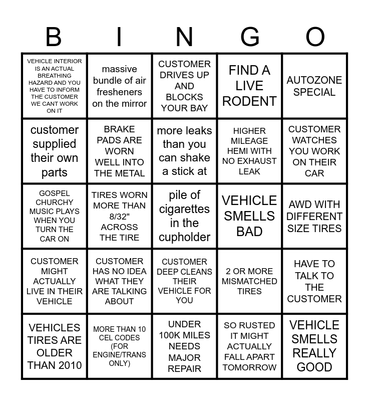 This bingo card has a free space and 24 words: CUSTOMER HAS NO IDEA WHAT THEY ARE TALKING ABOUT, MORE THAN 10 CEL CODES (FOR ENGINE/TRANS ONLY), more leaks than you can shake a stick at, VEHICLES TIRES ARE OLDER THAN 2010, AUTOZONE SPECIAL, VEHICLE INTERIOR IS AN ACTUAL BREATHING HAZARD AND YOU HAVE TO INFORM THE CUSTOMER WE CANT WORK ON IT, customer supplied their own parts, massive bundle of air fresheners on the mirror, VEHICLE SMELLS BAD, CUSTOMER DEEP CLEANS THEIR VEHICLE FOR YOU, HIGHER MILEAGE HEMI WITH NO EXHAUST LEAK, GOSPEL CHURCHY MUSIC PLAYS WHEN YOU TURN THE CAR ON, 2 OR MORE MISMATCHED TIRES, HAVE TO TALK TO THE CUSTOMER, BRAKE PADS ARE WORN WELL INTO THE METAL, SO RUSTED IT MIGHT ACTUALLY FALL APART TOMORROW, AWD WITH DIFFERENT SIZE TIRES, CUSTOMER DRIVES UP AND BLOCKS YOUR BAY, CUSTOMER WATCHES YOU WORK ON THEIR CAR, TIRES WORN MORE THAN 8/32" ACROSS THE TIRE, VEHICLE SMELLS REALLY GOOD, CUSTOMER MIGHT ACTUALLY LIVE IN THEIR VEHICLE, FIND A LIVE RODENT and UNDER 100K MILES NEEDS MAJOR REPAIR.