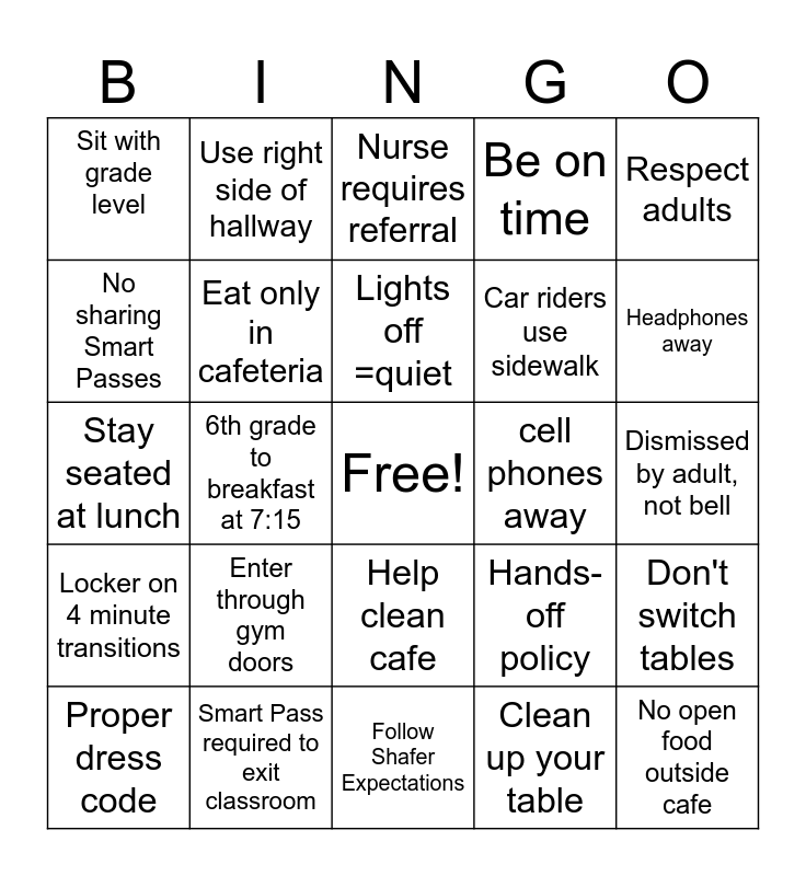 This bingo card has a free space and 24 words: Enter through gym doors, Smart Pass required to exit classroom, Lights off =quiet, Proper dress code, Respect adults, Sit with grade level, No sharing Smart Passes, Use right side of hallway, cell phones away, Help clean cafe, Car riders use sidewalk, Stay seated at lunch, Hands-off policy, Don't switch tables, Eat only in cafeteria, Clean up your table, Dismissed by adult, not bell, Nurse requires referral, Headphones away, 6th grade to breakfast at 7:15, No open food outside cafe, Locker on 4 minute transitions, Be on time and Follow Shafer Expectations.