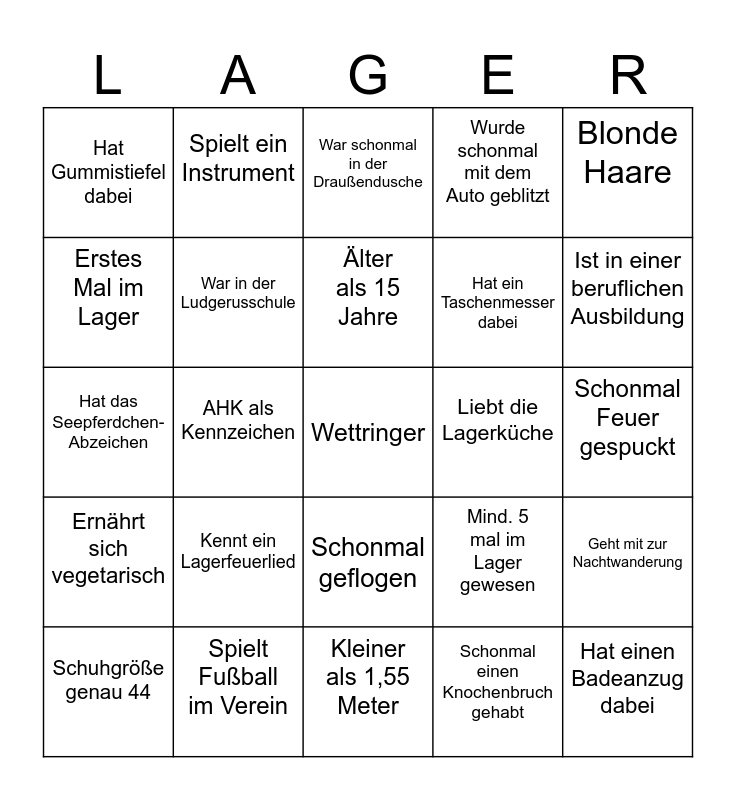 This bingo card has a free space and 24 words: Kennt ein Lagerfeuerlied, Spielt Fußball im Verein, Älter als 15 Jahre, Schuhgröße genau 44, Blonde Haare, Hat Gummistiefel dabei, Erstes Mal im Lager, Spielt ein Instrument, Liebt die Lagerküche, Schonmal geflogen, Hat ein Taschenmesser dabei, Hat das Seepferdchen-Abzeichen, Mind. 5 mal im Lager gewesen, Geht mit zur Nachtwanderung, War in der Ludgerusschule, Schonmal einen Knochenbruch gehabt, Schonmal Feuer gespuckt, War schonmal in der Draußendusche, Ist in einer beruflichen Ausbildung, AHK als Kennzeichen, Hat einen Badeanzug dabei, Ernährt sich vegetarisch, Wurde schonmal mit dem Auto geblitzt and Kleiner als 1,55 Meter.