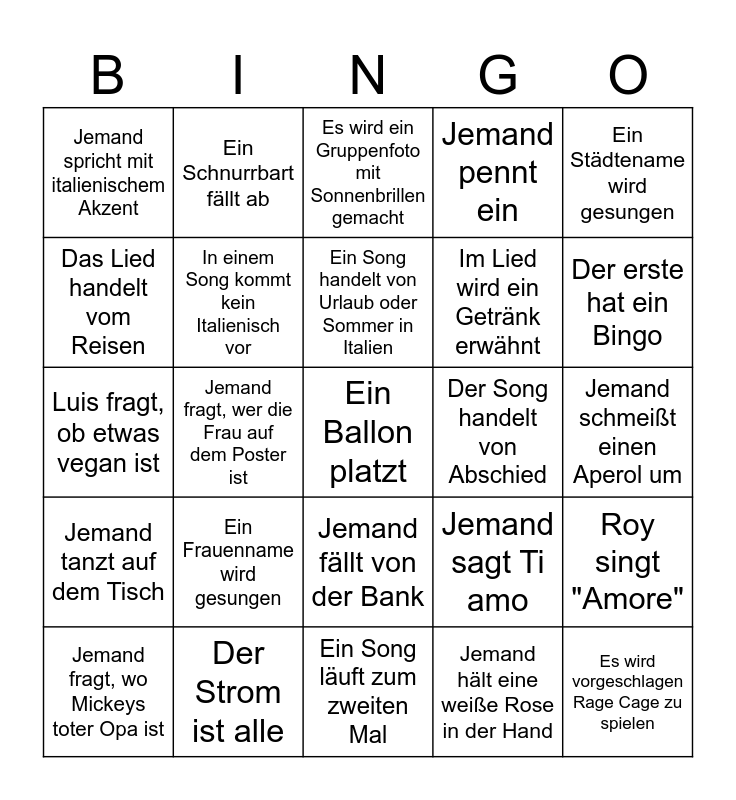 This bingo card has 25 words: Ein Frauenname wird gesungen, Ein Song läuft zum zweiten Mal, Ein Song handelt von Urlaub oder Sommer in Italien, Jemand fragt, wo Mickeys toter Opa ist, Ein Städtename wird gesungen, Jemand spricht mit italienischem Akzent, Das Lied handelt vom Reisen, Ein Schnurrbart fällt ab, Der Song handelt von Abschied, Jemand fällt von der Bank, Im Lied wird ein Getränk erwähnt, Luis fragt, ob etwas vegan ist, Jemand sagt Ti amo, Roy singt "Amore", In einem Song kommt kein Italienisch vor, Es wird vorgeschlagen Rage Cage zu spielen, Jemand schmeißt einen Aperol um, Es wird ein Gruppenfoto mit Sonnenbrillen gemacht, Der erste hat ein Bingo, Jemand fragt, wer die Frau auf dem Poster ist, Ein Ballon platzt, Der Strom ist alle, Jemand tanzt auf dem Tisch, Jemand pennt ein and Jemand hält eine weiße Rose in der Hand.