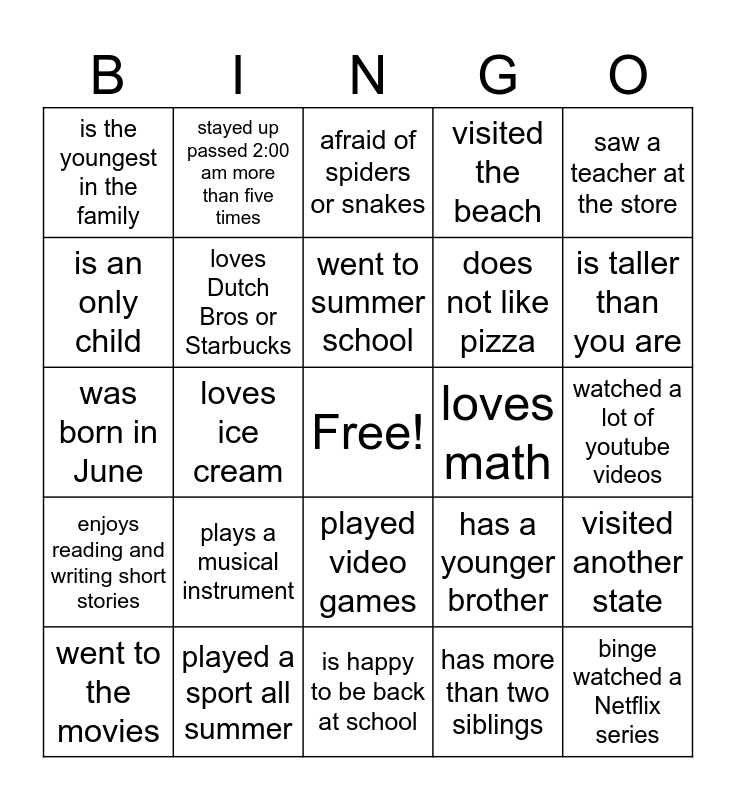 This bingo card has a free space and 24 words: went to the movies, plays a musical instrument, went to summer school, has more than two siblings, saw a teacher at the store, is the youngest in the family, stayed up passed 2:00 am more than five times, afraid of spiders or snakes, loves math, watched a lot of youtube videos, was born in June, loves Dutch Bros or Starbucks, has a younger brother, visited another state, is an only child, played a sport all summer, is happy to be back at school, visited the beach, is taller than you are, enjoys reading and writing short stories, loves ice cream, played video games, does not like pizza and binge watched a Netflix series.