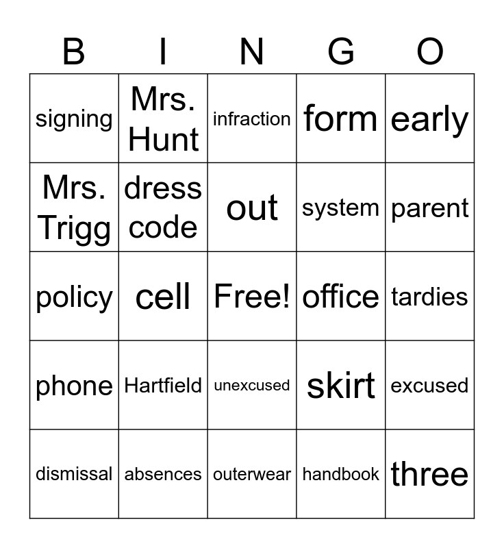 This bingo card has a free space and 29 words: uniform, absences, infraction, school, early, signing, dress code, out, office, excused, dismissal, cell, handbook, three, policy, late, outerwear, skirt, parent, phone, Hartfield, detention, system, tardies, Mrs. Trigg, Mrs. Hunt, unexcused, form and bell.