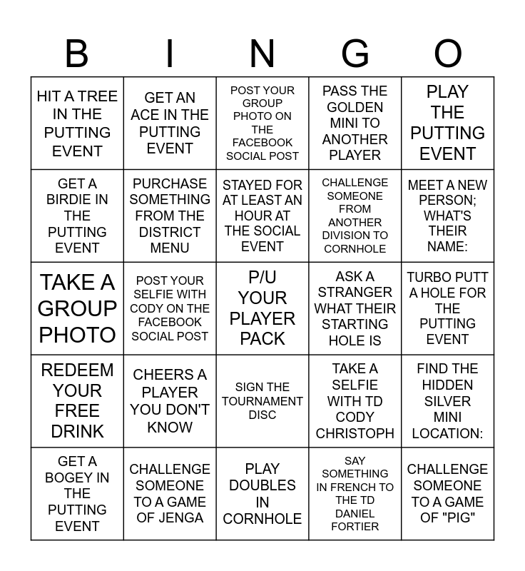 This bingo card has a free space and 24 words: CHEERS A PLAYER YOU DON'T KNOW, CHALLENGE SOMEONE TO A GAME OF JENGA, STAYED FOR AT LEAST AN HOUR AT THE SOCIAL EVENT, GET A BOGEY IN THE PUTTING EVENT, PLAY THE PUTTING EVENT, HIT A TREE IN THE PUTTING EVENT, GET A BIRDIE IN THE PUTTING EVENT, GET AN ACE IN THE PUTTING EVENT, ASK A STRANGER WHAT THEIR STARTING HOLE IS, SIGN THE TOURNAMENT DISC, CHALLENGE SOMEONE FROM ANOTHER DIVISION TO CORNHOLE, TAKE A GROUP PHOTO, TAKE A SELFIE WITH TD CODY CHRISTOPH, FIND THE HIDDEN SILVER MINI LOCATION:, PURCHASE SOMETHING FROM THE DISTRICT MENU, SAY SOMETHING IN FRENCH TO THE TD DANIEL FORTIER, TURBO PUTT A HOLE FOR THE PUTTING EVENT, POST YOUR GROUP PHOTO ON THE FACEBOOK SOCIAL POST, MEET A NEW PERSON; WHAT'S THEIR NAME:, POST YOUR SELFIE WITH CODY ON THE FACEBOOK SOCIAL POST, CHALLENGE SOMEONE TO A GAME OF "PIG", REDEEM YOUR FREE DRINK, PASS THE GOLDEN MINI TO ANOTHER PLAYER and PLAY DOUBLES IN CORNHOLE.