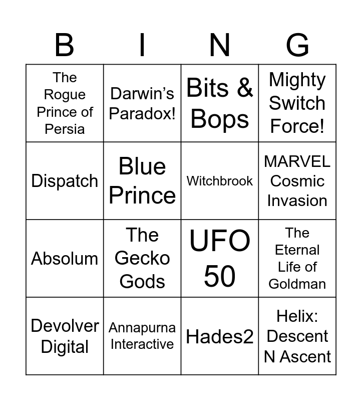 This bingo card has 16 words: Annapurna Interactive, The Eternal Life of Goldman, Bits & Bops, The Rogue Prince of Persia, Absolum, Darwin’s Paradox!, UFO 50, Hades2, Dispatch, Blue Prince, Devolver Digital, Mighty Switch Force!, The Gecko Gods, MARVEL Cosmic Invasion, Witchbrook and Helix: Descent N Ascent.