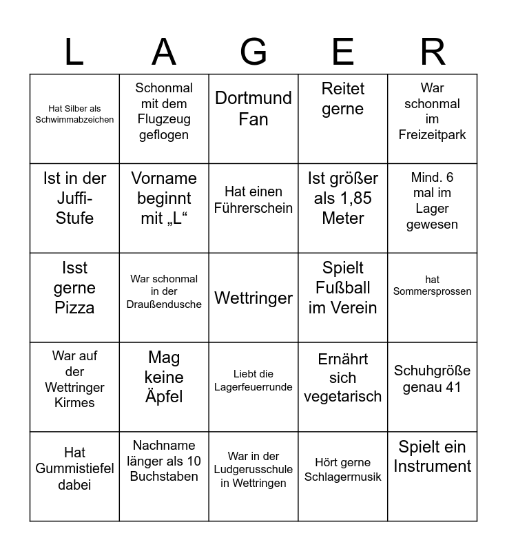 This bingo card has a free space and 24 words: Mag keine Äpfel, Nachname länger als 10 Buchstaben, Hat einen Führerschein, Hat Gummistiefel dabei, War schonmal im Freizeitpark, Hat Silber als Schwimmabzeichen, Ist in der Juffi-Stufe, Schonmal mit dem Flugzeug geflogen, Spielt Fußball im Verein, Liebt die Lagerfeuerrunde, Ist größer als 1,85 Meter, Isst gerne Pizza, Ernährt sich vegetarisch, Schuhgröße genau 41, Vorname beginnt mit „L“, Hört gerne Schlagermusik, hat Sommersprossen, Dortmund Fan, Mind. 6 mal im Lager gewesen, War schonmal in der Draußendusche, Spielt ein Instrument, War auf der Wettringer Kirmes, Reitet gerne and War in der Ludgerusschule in Wettringen.