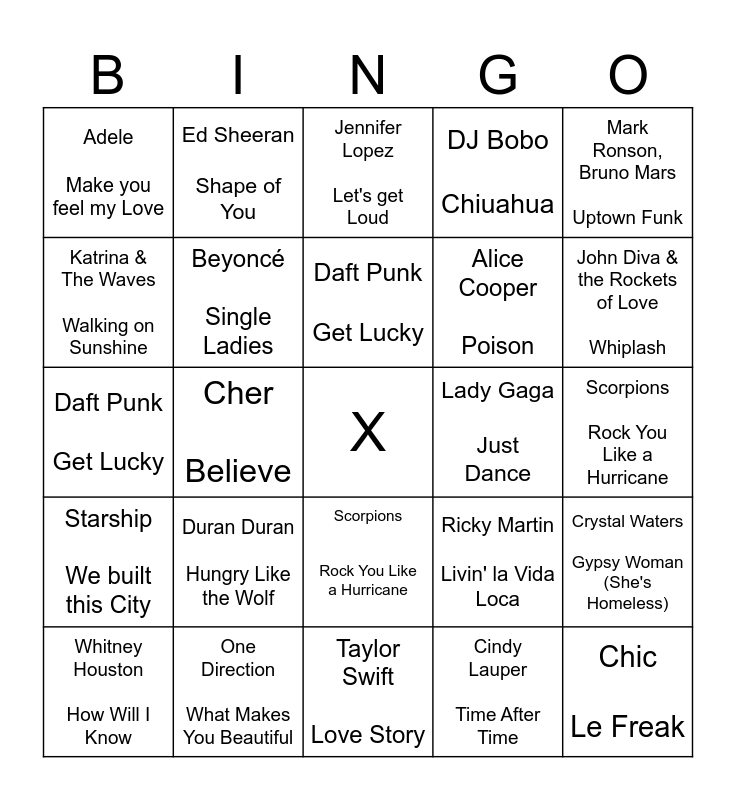 This bingo card has a free space and 34 words: P!nk Get the Party Started, Cindy Lauper Time After Time, The Pointer Sisters I'm So Excited, Irgendwas von Helene Fischer, Starship We built this City, Beyoncé Single Ladies, Mark Ronson, Bruno Mars Uptown Funk, Whitney Houston How Will I Know, Ed Sheeran Shape of You, Toto Africa, Daft Punk Get Lucky, Jennifer Lopez Let's get Loud, Avicii Wake Me Up, Maroon 5 Moves Like Jagger, Lady Gaga Just Dance, John Diva & the Rockets of Love Whiplash, One Direction What Makes You Beautiful, Daft Punk Get Lucky, Duran Duran Hungry Like the Wolf, Ricky Martin Livin' la Vida Loca, Scorpions Rock You Like a Hurricane, Los Del Río Macarena, Adele Make you feel my Love, Scorpions Rock You Like a Hurricane, Taylor Swift Love Story, Chic Le Freak, DJ Bobo Chiuahua, Macklemore feat. Ryan Lewis Can't Hold Us, Alice Cooper Poison, Katrina & The Waves Walking on Sunshine, Kool & The Gang Ladies Night, Cher Believe, Crystal Waters Gypsy Woman (She's Homeless) and Journey Don't Stop Believing.