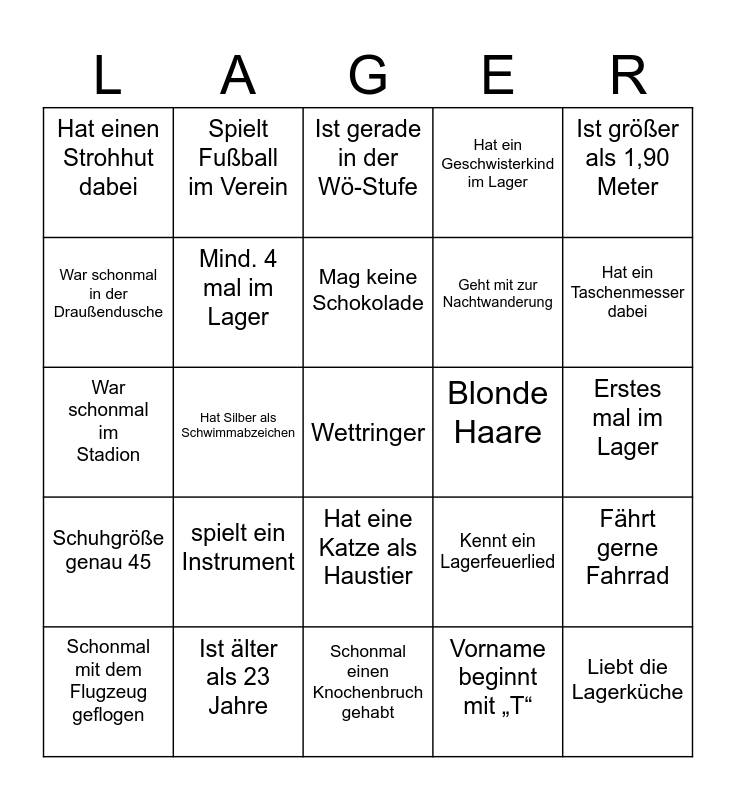 This bingo card has a free space and 24 words: spielt ein Instrument, Ist älter als 23 Jahre, Mag keine Schokolade, Schonmal mit dem Flugzeug geflogen, Ist größer als 1,90 Meter, Hat einen Strohhut dabei, War schonmal in der Draußendusche, Spielt Fußball im Verein, Blonde Haare, Hat eine Katze als Haustier, Geht mit zur Nachtwanderung, War schonmal im Stadion, Kennt ein Lagerfeuerlied, Fährt gerne Fahrrad, Mind. 4 mal im Lager, Vorname beginnt mit „T“, Erstes mal im Lager, Ist gerade in der Wö-Stufe, Hat ein Taschenmesser dabei, Hat Silber als Schwimmabzeichen, Liebt die Lagerküche, Schuhgröße genau 45, Hat ein Geschwisterkind im Lager and Schonmal einen Knochenbruch gehabt.