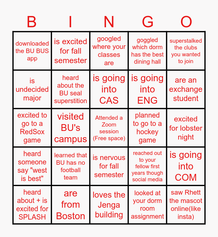 This bingo card has a free space and 29 words: joined the GroupMe (group chat), are from Boston, googled where your classes are, got lost on the BU website, superstalked the clubs you wanted to join, downloaded the BU BUS app, heard about the BU seal superstition, is going into CAS, planned to go to a hockey game, is going into COM, heard about + is excited for SPLASH, visited BU's campus, looked at your dorm room assignment, saw Rhett the mascot online(like insta), excited to go to a RedSox game, followed BU on instagram, loves the Jenga building, reached out to your fellow first years though social media, are an exchange student, heard someone say "west is best", learned that BU has no football team, is going into Questrom, is going into ENG, excited for lobster night, is undecided major, is excited for fall semester, is nervous for fall semester, goggled which dorm has the best dining hall and is nervous to take the T.