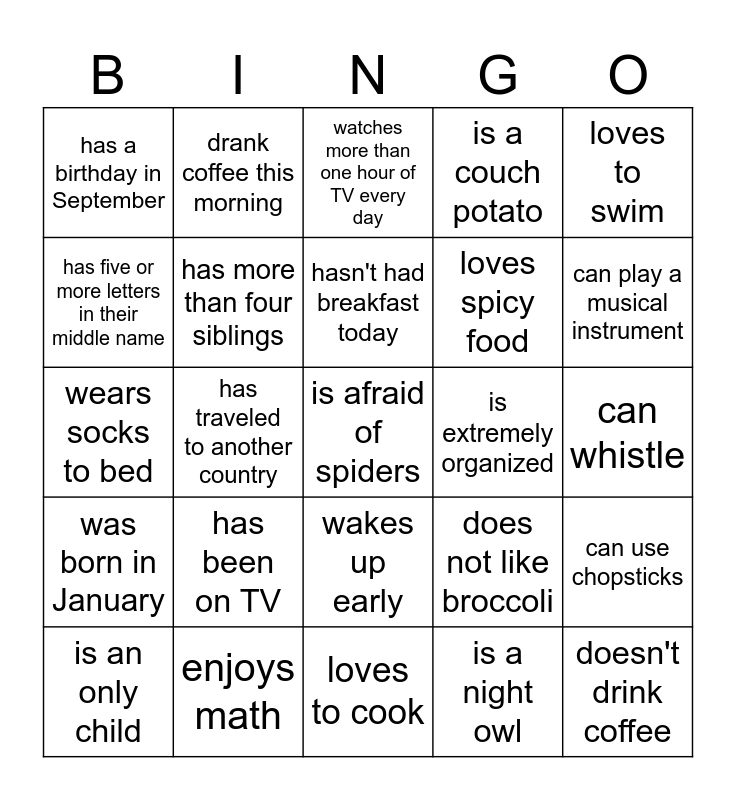 This bingo card has 25 words: has been on TV, loves to cook, hasn't had breakfast today, is an only child, loves to swim, has a birthday in September, has five or more letters in their middle name, drank coffee this morning, is extremely organized, wakes up early, loves spicy food, wears socks to bed, does not like broccoli, can use chopsticks, has more than four siblings, doesn't drink coffee, can whistle, watches more than one hour of TV every day, can play a musical instrument, has traveled to another country, is afraid of spiders, enjoys math, was born in January, is a couch potato and is a night owl.